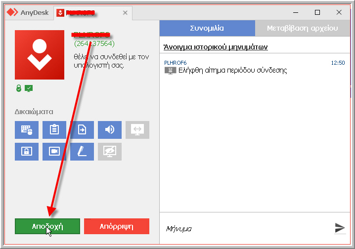 ΒΗΜΑ 3: Όταν μετά από λίγο εκκινήσει η εφαρμογή απομακρυσμένης πρόσβασης, αφενός πρέπει να δώσετε (όποτε εμφανιστεί) τον 9ψήφιο αριθμό διεύθυνσης που θα εμφανιστεί στην οθόνη σας επάνω αριστερά, αφετέρου (όταν βγει η ανάλογη προτροπή στην οθόνη σας) πρέπει να ΕΠΙΤΡΕΨΕΤΕ (πατώντας το κουμπί ΑΠΟΔΟΧΗ) τη σύνδεση του Υποστηρικτή/Τεχνικού, προκειμένου να αποκτήσει έτσι (και μόνο έτσι) με τη ΣΥΝΑΙΝΕΣΗ σας πρόσβαση απομακρυσμένα στον Η/Υ σας (διαφορετικά, ΔΕΝ μπορεί ο Υποστηρικτής/Τεχνικός να έχει πρόσβαση στον Η/Υ σας!):