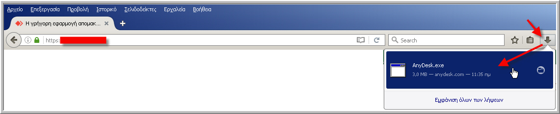 ΑΡΧΗ ΔΙΑΔΙΚΑΣΙΑΣ --- ΒΗΜΑ 1: Έχοντας φτάσει εδώ, πατήστε επάνω στην ακόλουθη καταχώρηση, για να κατεβάσετε (download) στον Η/Υ σας (και να αποθηκεύσετε), το σχετικό πρόγραμμα: ΒΗΜΑ 2: Ανοίγετε/εκτελείτε το πρόγραμμα (που μόλις κατεβάσατε και αποθηκεύσατε στο προηγούμενο βήμα) με όνομα AnyDesk.exe, από την ανάλογη «θέση»: α) «Θέση»: αν χρησιμοποιείτε ως πρόγραμμα περιήγησης (browser) το MOZILLA FIREFOX, το αρχείο αυτό θα το βρείτε στα ΛΗΦΘΕΝΤΑ ΑΡΧΕΙΑ σας (π.χ.):